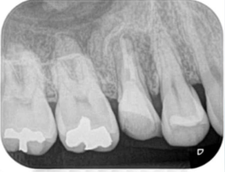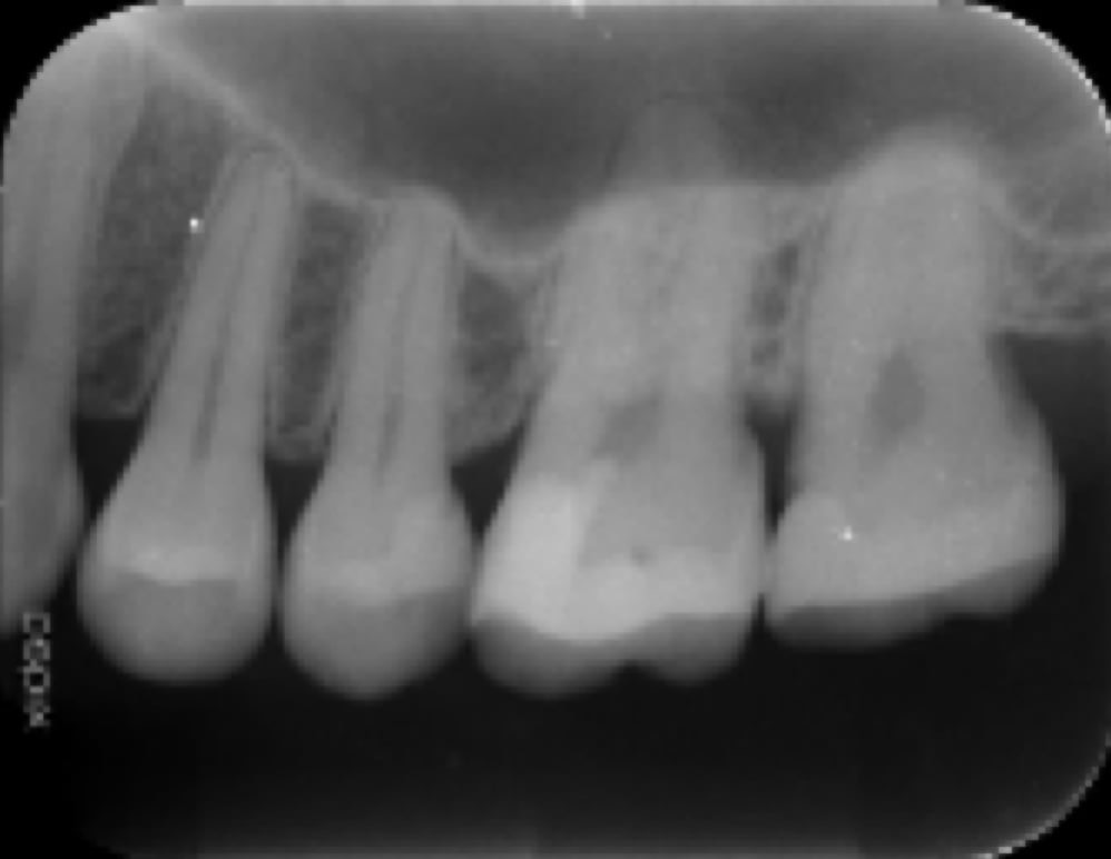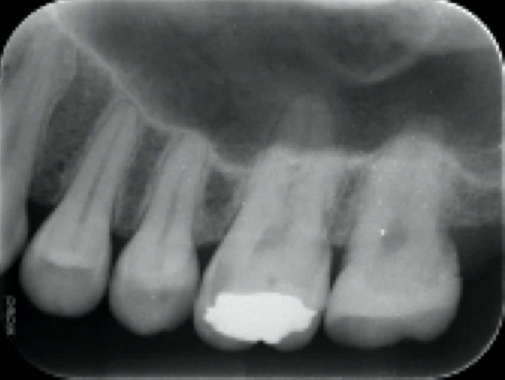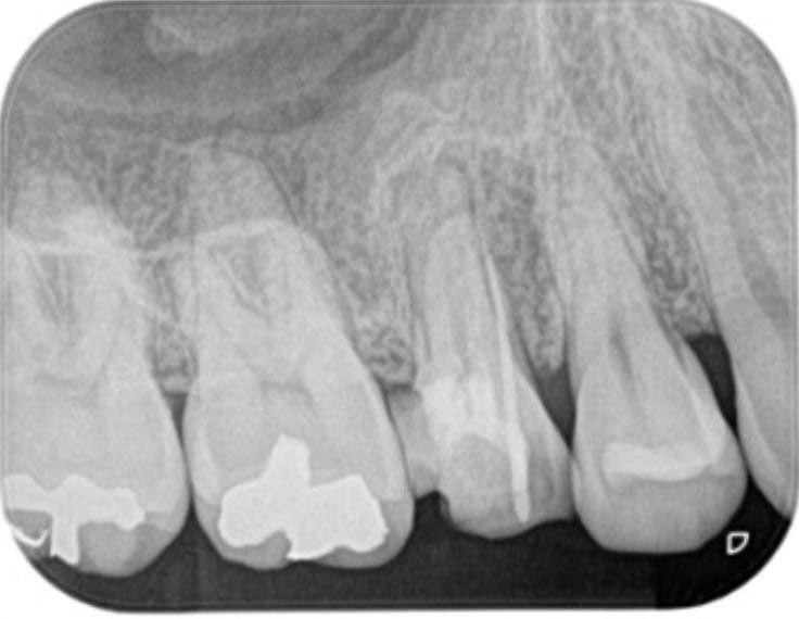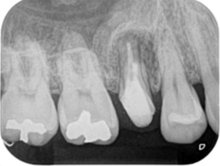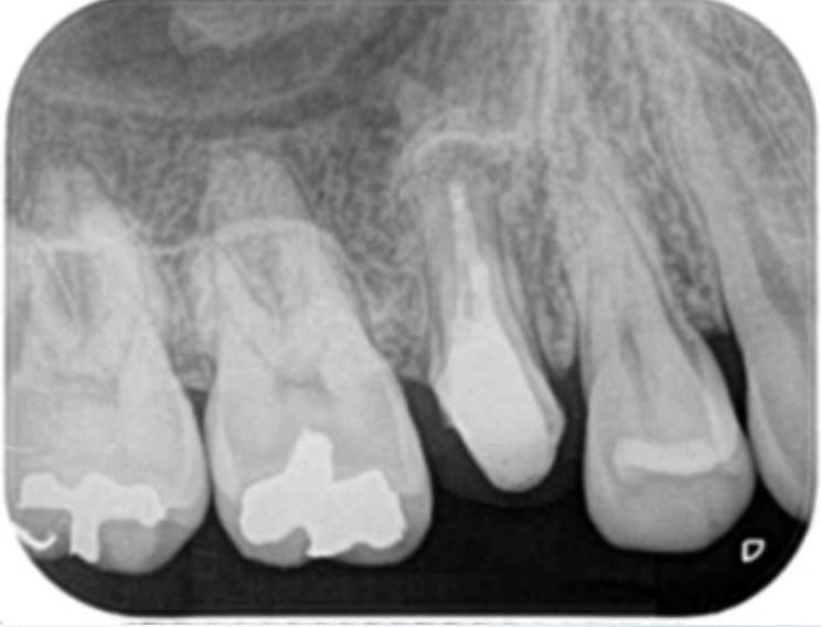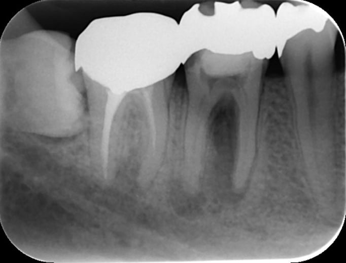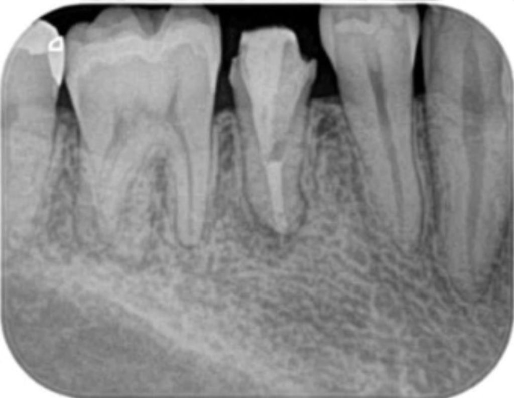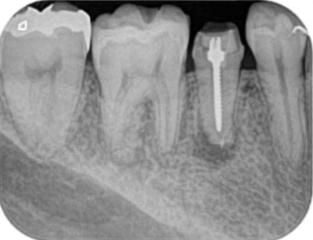 術後(長い金属の棒はマイクロスコープ下で安全に除去し薬を詰めた状態。わずかに画像が変化し治癒してきている)